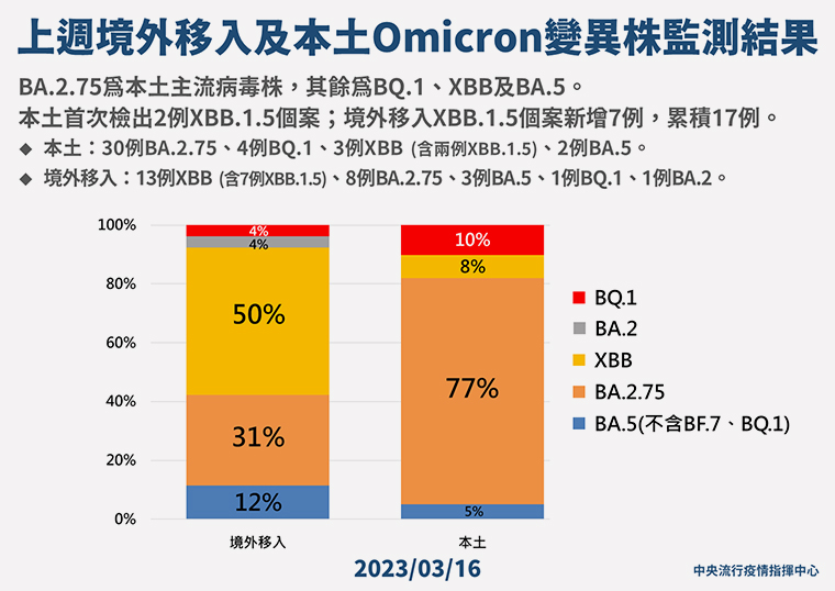 發言人羅一鈞表示本土仍以BA.2.75為主流病毒株,本週定序了65株病毒株,有39支本土、26支境外。其中有30例BA.2.75,4例BQ.1,3例XBB,以及2例XBB.1.5。感染XBB.1.5的2例是在國內首見的本土病例,為10多歲少女與50多歲女性,全屬於重複感染與輕症個案,定序確定為本土XBB.1.5,,分別於2月下旬與3月初二次感染確診。