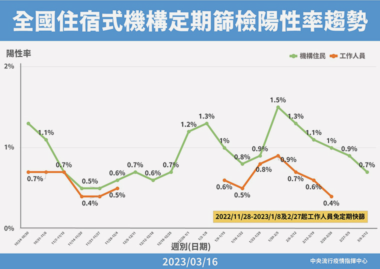 長照機構定期篩檢本週陽性率為0.7% 上次公布是0.9%。目前定期篩檢措施將持續到3月31日,下周宣布是否延長。