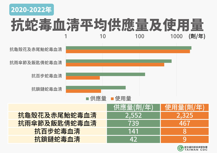 如果被蛇咬傷不必驚慌,只要就醫並由醫師使用血清即可治癒。疾管署說明,2020至2022年每年平均供應量分別為抗龜殼花及赤尾鮐蛇毒血清約2,552劑、抗雨傘節及飯匙倩蛇毒血清約739劑、抗百步蛇毒血清約141劑、抗鎖鏈蛇毒血清約42劑。疾管署統計,2020至2022年每年平均使用2,809劑抗蛇毒血清,抗龜殼花及赤尾鮐蛇毒血清約使用2,325劑、抗雨傘節及飯匙倩蛇毒血清約使用467劑、抗百步蛇毒血清約使用8劑,抗鎖鏈蛇毒血清約使用9劑,目前均供應無虞。疾管署提醒,抗蛇毒血清為醫師處方用藥,醫療院所才可購買,請民眾切勿購買來路不明藥物。目前全國約有190多家醫療院所儲備抗蛇毒血清。