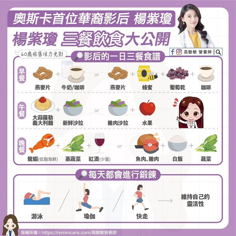 ▲高敏敏分享楊紫瓊的3餐飲食。(圖/截取自「高敏敏營養師」FB)