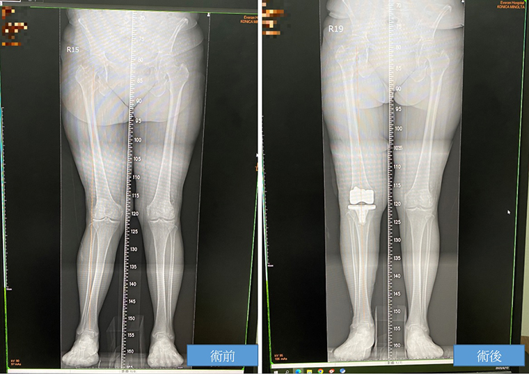 針對患者的治療情況,醫生進行了全人工膝關節置換手術,除了矯正膝蓋歪斜的角度外,還切除了軟骨和骨頭磨損的部分,提供新的關節界面,以改善步態和緩解疼痛。手術後的隔天,巫女士已能下床行走,開始進行復健訓練。1個月後的回診,她的行走姿勢已恢復正常,可以不需要使用拐杖,讓她非常欣喜。