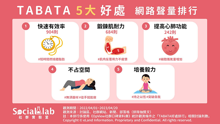 【NOW健康 陳郁茹/台北報導】現代生活十分忙碌,許多人想在繁忙之中維持體態、卻又抽不出時間去健身房或其他運動場所,因此居家運動的風氣逐漸盛行,其中TABATA更是許多民眾甩肉減肥時的首選;而究竟TABATA有哪些好處呢?《Social Lab社群實驗室》本次透過《OpView社群口碑資料庫》追蹤1年內「TABATA好處」相關話題的網路聲量,帶您了解網友熱議的5大TABATA好處排行。