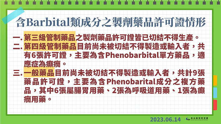 ▲含Barbital類成分之製劑藥品許可證,目前各類藥品的情況。(圖/食藥署提供)
