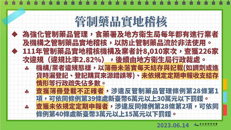 為強化管制藥品管理,食藥署及地方衛生局每年都有進行業者及機構之管制藥品實地稽核,以防止管制藥品流於非法使用。111年管制藥品實地稽核機構及業者計8,010家次,查獲226家次違規(違規比率2.82%),違規態樣皆以簿冊未落實每天結存與記載,如調劑或進貨時漏登記、登記購買來源錯誤等;以及未依規定定期申報收支結存情形等行政疏失佔多數。