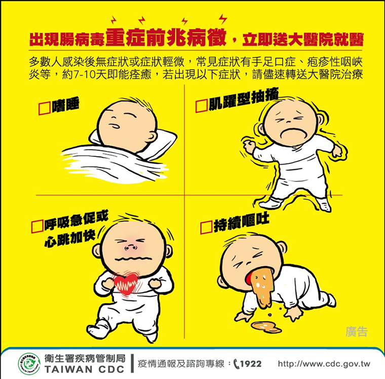 多數人感染腸病毒後,可能毫無症狀或症狀較為輕微,約7至10天即可痊癒,若出現嗜睡、肌躍型抽搐、持續嘔吐、呼吸急促或心跳加快等重症前兆,請儘速至大醫院進行治療,以免延誤就醫時間。