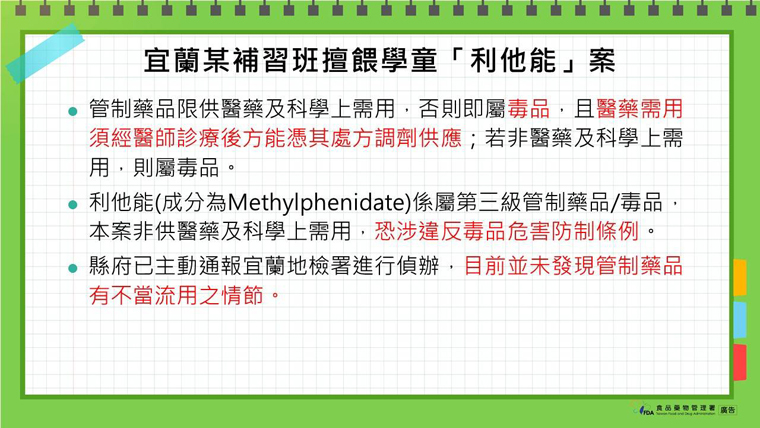關於藥品來源,陳惠芳說明,初步調查,藥品的來源,是同班同學中有人持有依處方使用的藥物。她也提到,利他能為第3級管制藥品,補教業者的行為,很可能已違反《毒品危害防制條例》,其他細節須由縣府衛生局說明,宜蘭縣府已通報宜蘭地檢署偵辦,目前無發現管制藥品不當使用。