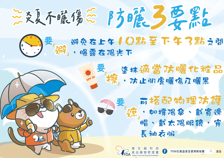 夏季是戶外運動,或水上活動最豐沛的時期,為避免肌膚曬黑、曬傷,防曬很重要。食藥署提醒消費者,防曬3要點─要避、要擦、要遮,把握3要點讓肌膚不受傷。