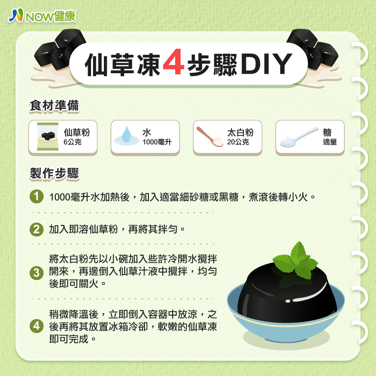 如果不想要買外面的仙草來吃,不妨可先購買即溶仙草粉6公克、水1000毫升、太白粉20公克、糖適量,在家跟著以下4步驟DIY仙草凍:
