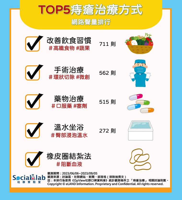 觀察近3個月內網友針對「痔瘡治療方式」相關話題的討論,發現「改善飲食習慣」為最常被網友提及的治療方式。痔瘡好發族群在飲食方面常有「嗜辣、水分及纖維攝取不足、好菸酒」的共通點,對此便有醫師點出,若能多加攝取高纖食物、蔬果並多補充水分,就能夠令糞便較為鬆軟,更有利排便的順暢度,也能夠減少排便不順對於痔瘡的刺激。