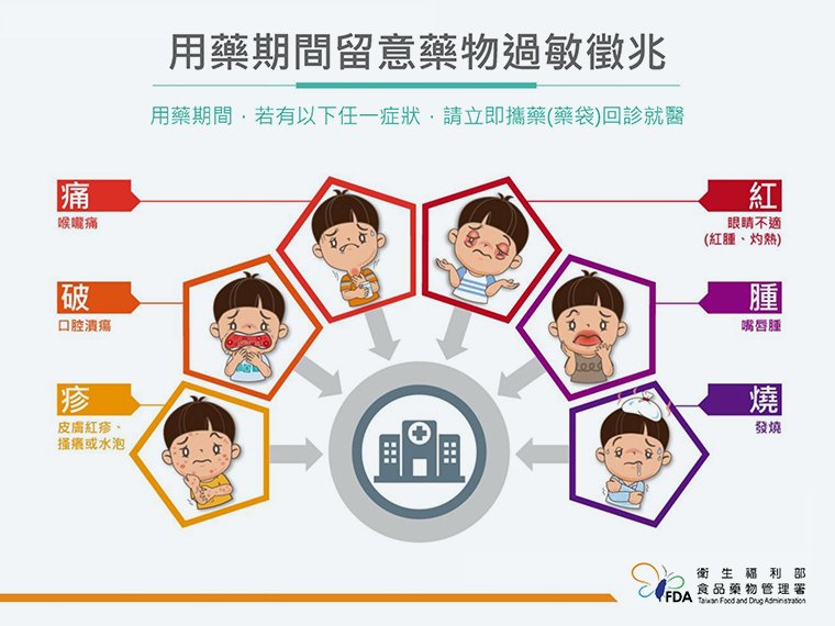 ▲痛風藥物若引起過敏,恐會發生嘴唇紅腫、眼睛不適、發燒、喉嚨痛、皮膚紅疹、口腔潰瘍等症狀。(圖/食藥署提供)