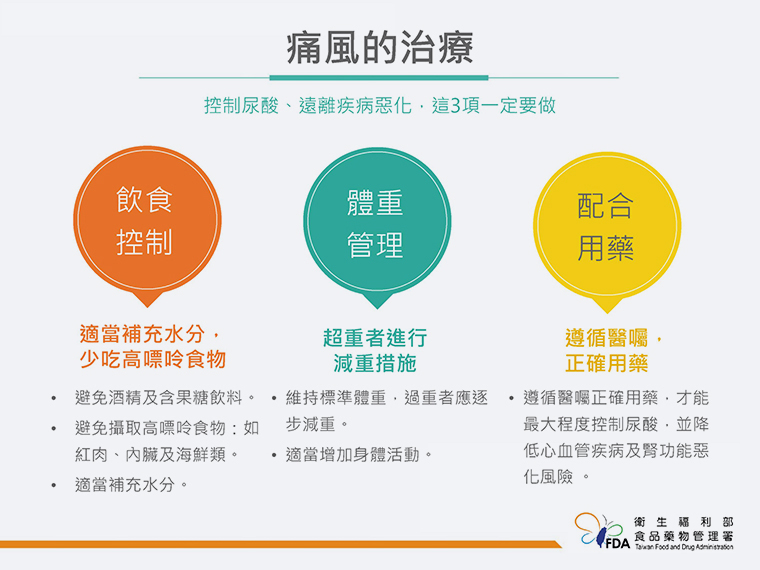 ▲食藥署提醒,痛風病友在飲食及生活習慣上需多加注意,尤其要注意體重管理,積極配合用藥,以免症狀惡化。(圖/食藥署提供)