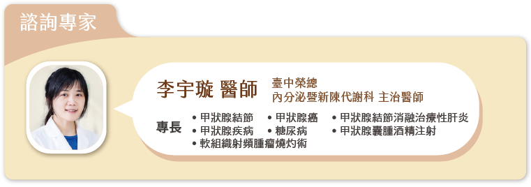 最後,李宇璇醫師仍呼籲,積極治療甲狀腺癌並不可怕,目前醫療科技進步,健保給付下也有不錯的治療選擇,即使不幸罹患甲狀腺癌,只要遵從醫囑積極治療,多與醫師溝通,就能減少對於治療的不安感,仍有機會擁有良好的生活品質。