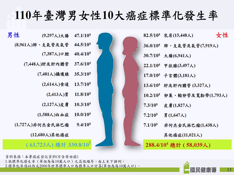▲110年國人男女性10大癌症標準化發生率。(圖/國健署提供)