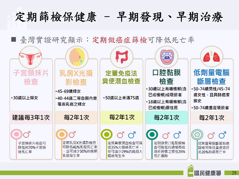 ▲定期做5癌症篩檢,早期發現、早期治療,可降低死亡率。(圖/國健署提供)