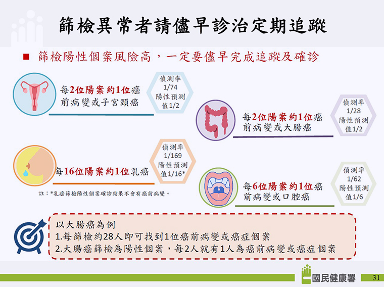 ▲癌症篩檢呈現陽性,應儘早診治並定期追蹤。(圖/國健署提供)