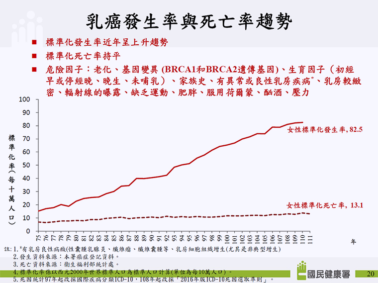 ▲乳癌發生率與死亡率趨勢。(圖/國健署提供)