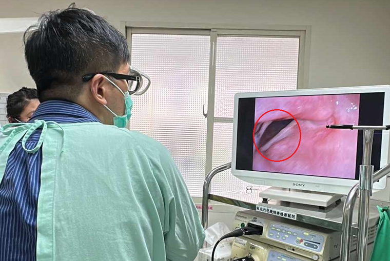 ▲李自祥醫師說明,病人因聲帶麻痺閉合不全(紅圈所示),聲音沙啞且進食容易嗆咳,經微創聲帶玻尿酸注射手術治療後,聲帶可閉合,聲音沙啞明顯改善且進食不會嗆咳。(圖/新竹台大醫院提供)