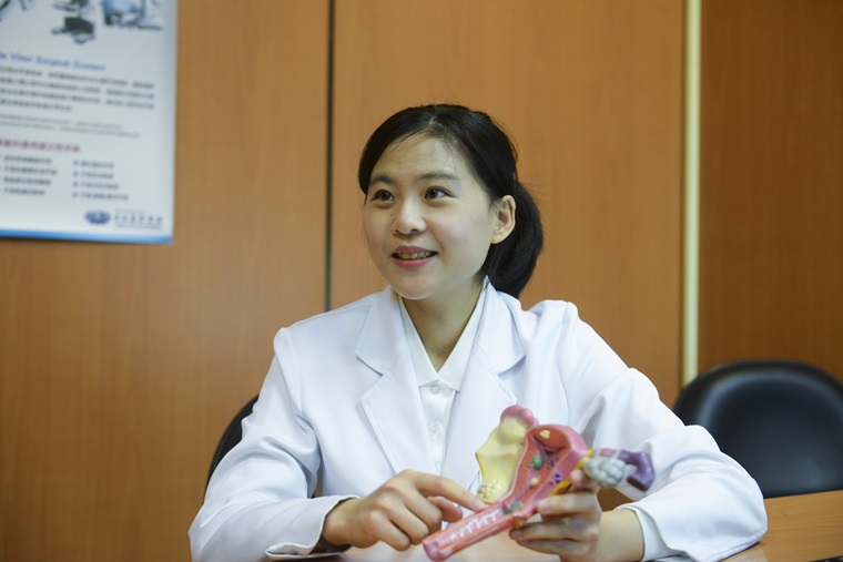 ▲台北慈濟醫院婦產科醫師邱筱宸說明避孕器穿透子宮的位置。(圖/台北慈濟醫院提供)