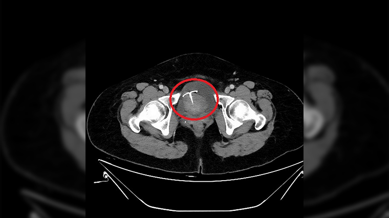 ▲電腦斷層影像顯示避孕器已經穿透子宮,須執行子宮開腹切除術將子宮摘除。(圖/台北慈濟醫院提供)