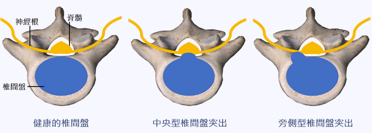 人體有5節的腰椎及1節的薦椎,椎體之間會有椎間盤,每個椎間盤都可能發生突出,不過最常見是發生在第4與第5節腰椎之間,或是第5腰椎與薦椎之間。陳宇聖描述,椎間盤突出時易壓迫到周邊脊隨,以及脊隨所分出的神經根,造成患者下肢痠麻,也就是「坐骨神經痛」。當神經壓迫嚴重時,恐導致下肢無力、大小便失禁的情形。
