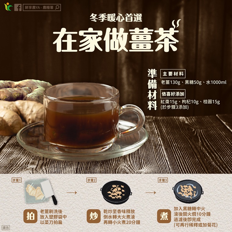值得注意的是,薑茶一般會選用栽培10個月以上的老薑,纖維較粗、汁液較少,熬煮後風味濃厚,辛辣味也較為強烈,因此民眾在挑選食材時,可以特別留意。若準備好上述食材後,不妨跟著以下3步驟一起製作吧!