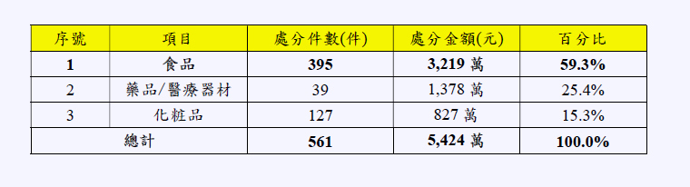 【NOW健康 陳如頤/台北報導】台北市政府衛生局統計112年違規廣告查緝成果,食品、藥品/醫療器材及化粧品違規廣告共開罰561件、裁罰5,424萬元。其中食品395件,裁罰金額3,219萬元(59.3%)金額最高,藥品/醫療器材占39件、裁罰1,378萬元(25.4%)居次,化粧品127件、裁罰827萬元(15.3%)位居第3名。