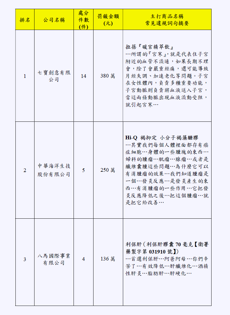 台北市衛生局統計罰鍰累計前3名之違規產品廣告,罰鍰累計第1名為「七寶創意有限公司」,違規廣告罰鍰達380萬元,該公司之「拉蓓『暖宮精萃飲』」食品廣告詞句涉及醫療效能。罰鍰累計第2名為「中華海洋生技股份有限公司」,違規廣告罰鍰達250萬元,其「Hi-Q 褐抑定 小分子褐藻醣膠」食品廣告詞句涉及醫療效能。罰鍰累計第3名為「八馬國際事業有限公司」,違規廣告罰鍰136萬元,該公司之「利保肝(利保肝膠囊70毫克【衛署藥製字第031910號】)」產品廣告,與藥品廣告核定表內容不符,台北市衛生局針對以上違規廣告已依法進行裁罰。