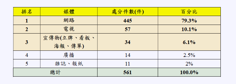 以違規廣告媒體分類統計分析,網路445件(79.3%)最多,其次為電視共57件(10.1%),宣傳物(立牌、看板、海報、傳單)34件(6.1%)居第3位。進一步分析網站違規廣告,以公司官網275件最多、裁罰金額2,555萬元,另針對社群媒體進行分類統計,Facebook共計42件、裁罰399萬元,Instagram有28件、裁罰233萬元,YouTube則有8件、裁罰186萬元,Line開罰4件、裁罰117萬元,TikTok有1件、裁罰8萬元。