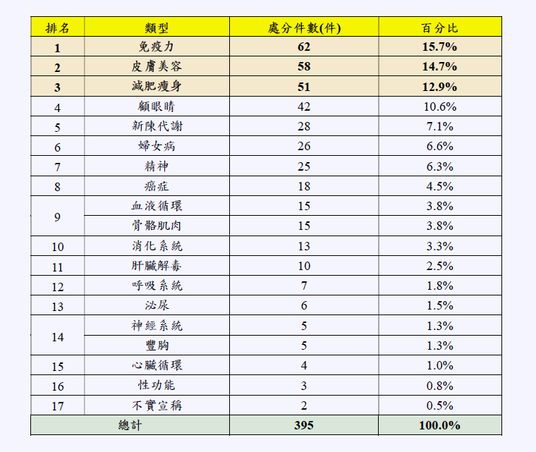 台北市衛生局進一步分析,違規食品廣告以宣稱提升免疫力類占第1位,共62件(15.7%),其次為宣稱皮膚美容類58件(14.7%)及宣稱減肥瘦身類51件(12.9%)居第3位。