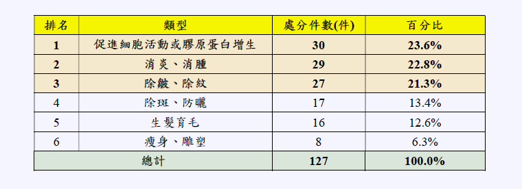 違規化粧品廣告以宣稱促進細胞活動或膠原蛋白增生類占第1位,共30件(23.6%),其次為消炎、消腫類共29件((2.8%),除皺、除紋類宣稱共27件(21.3%)居第3位。