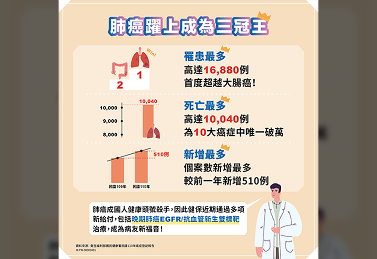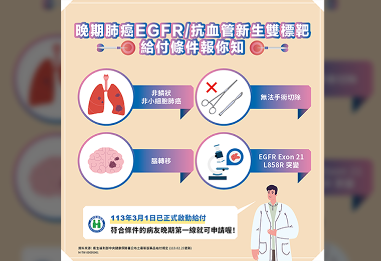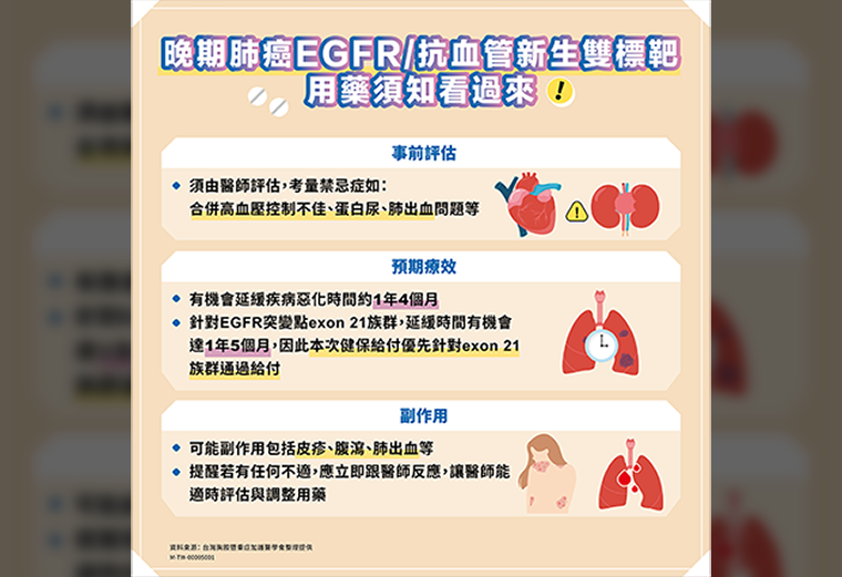 ▲抗血管新生合併口服EGFR雙標靶治療自3月起納入健保給付,符合條件病友可盡快向醫師諮詢。(圖/台灣胸腔暨重症加護醫學會提供)