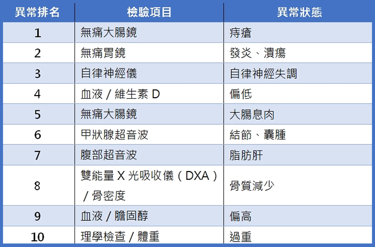 ▲2023年10大健檢異常率排名與檢驗的異常狀態如上。(圖/聯安診所提供)