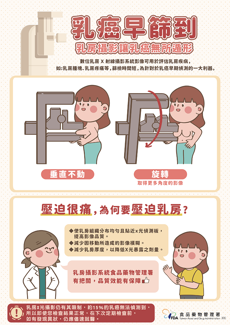 「乳房X光攝影」是目前國際上經實證有效的乳癌篩檢工具, 食藥署指出,數位乳房X射線攝影系統影像可用於評估乳房疾病,如乳房腫塊、乳房疼痛等,篩檢時間短,為針對於乳房早期偵測的一大利器。國健署提醒,民眾在檢查時需脫掉上半身的衣服,故不要穿連身衣裙;事前也不要於乳房、腋下塗抹除臭劑、粉劑及護膚霜等,以免產生假影,影響醫師判讀影像。