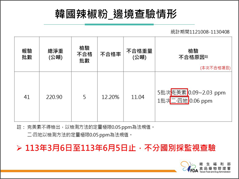 根據食藥署統計,從112年10月8日起至113年4月8日止,韓國辣椒粉邊境報驗批數為41批,檢驗不合格有5批,不合格率為12.2%,主要違規因素有5批次檢到克美素;1批次檢出二.四地。林金富指出,自113年3月6日至113年6月5日止,食藥署持續在邊境對韓國辣椒粉採監視查驗。