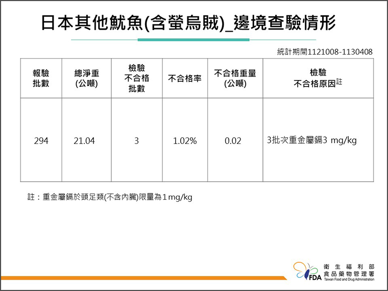 根據食藥署統計,從112年10月8日起至113年4月8日止,日本其他魷魚(含螢烏賊)的報驗批數為294批,檢驗不合格有3批,不合格率為1.02%,主要違規因素皆是重金屬鎘3mg/kg。