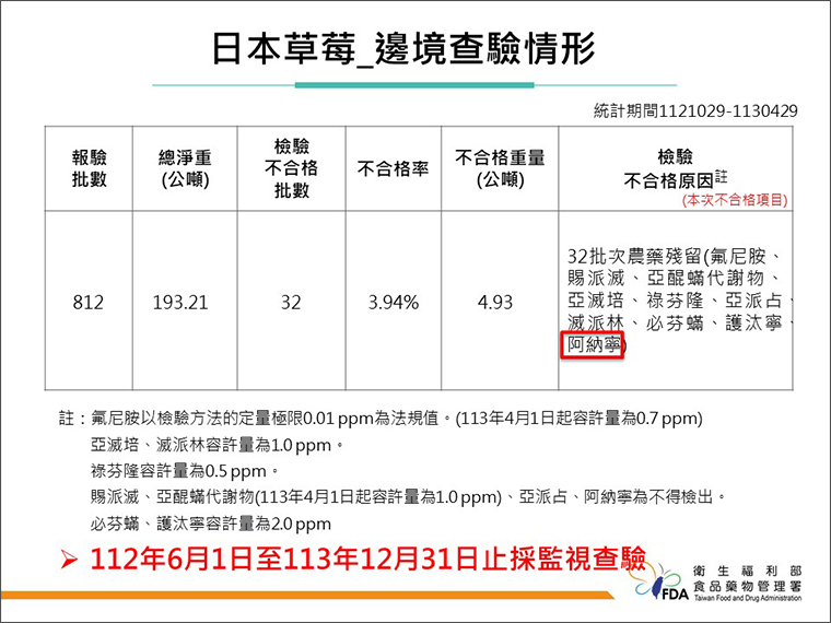 根據食藥署統計,從112年10月29日起至113年4月29日止,日本草莓的報驗批數為812批,檢驗不合格有32批,不合格率為3.94%,主要違規因素為檢驗到氟尼胺、賜派滅、亞滅培等等農藥殘留不合格。林金富指出,食藥署已在112年6月1日至113年12月31日止,對於日本草莓採取監視查驗。