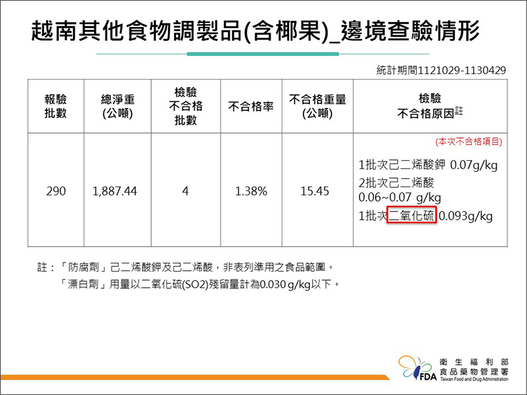 根據食藥署統計,從112年10月29日起至113年4月29日止,越南其他食物調製品(含椰果)邊境報驗批數為290批,檢驗不合格有4批,不合格率為1.38%,主要違規因素有1批次檢到防腐劑己二烯酸鉀0.07g/kg;2批次檢出己二烯酸0.06至0.07g/kg;1批次檢出二氧化硫0.093g/kg。