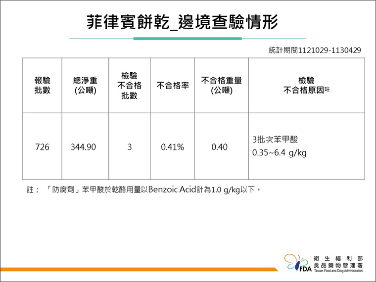 根據食藥署統計,從112年10月29日起至113年4月29日止,菲律賓餅乾邊境報驗批數為726批,檢驗不合格有3批,不合格率為0.41%,主要違規因素有3批次檢到苯甲酸0.35至6.4g/kg。