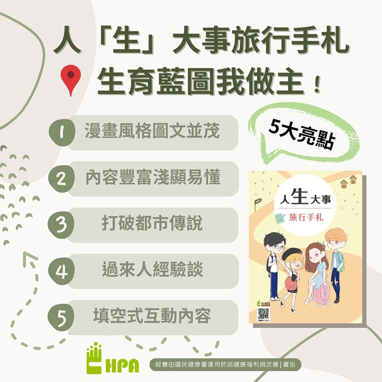 現代網路資訊發達,各種消息流通迅速,跟生育相關的資訊各式各樣都有,哪些才是正確的內容呢?國健署推出《人「生」大事旅行手札》,引導讀者思考人生歷程中,可能遭遇的生育及養育相關問題,手冊包含5大亮點: