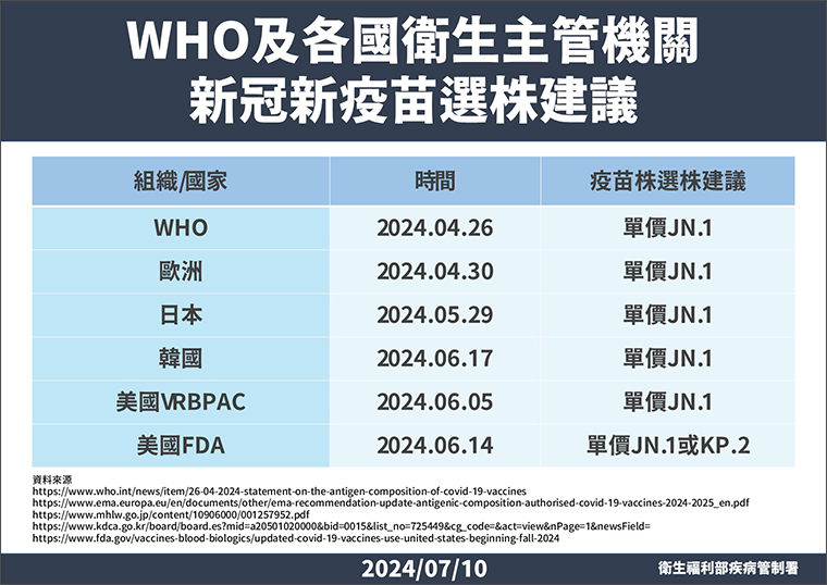 ▲世界衛生組織及各國對於新冠疫苗選株建議。(圖/疾管署提供)