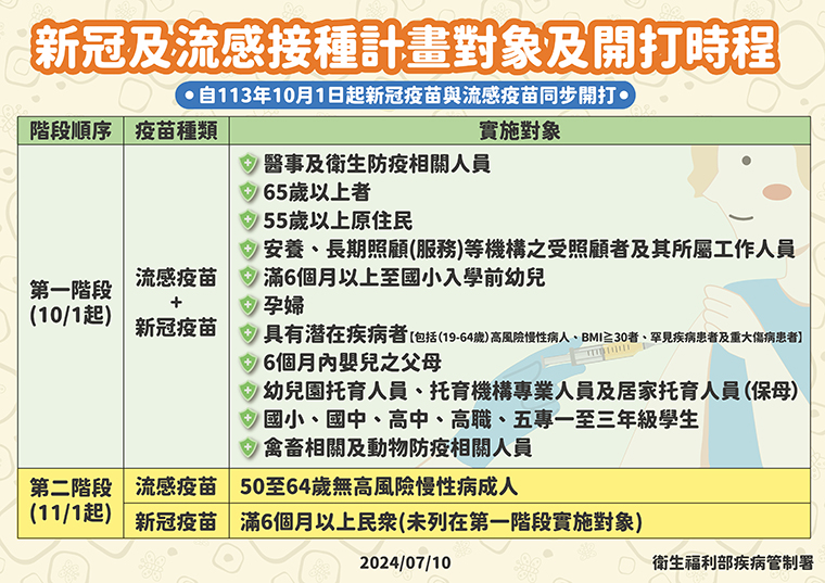 ▸第1階段:10月開始,提供醫事人員、65歲以上長者、55歲以上原住民、孕婦、禽畜及動物防疫相關人員、6個月以上至高中職學生、長照機構工作人員、潛在疾病者、家有未滿6個月大嬰兒的父母、保母等對象接種流感及新冠疫苗。