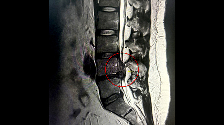 ▲根據檢查結果,魏先生的第4、5節約有4公分大的椎間盤突出,嚴重壓迫神經。(圖/台北慈濟醫院提供)