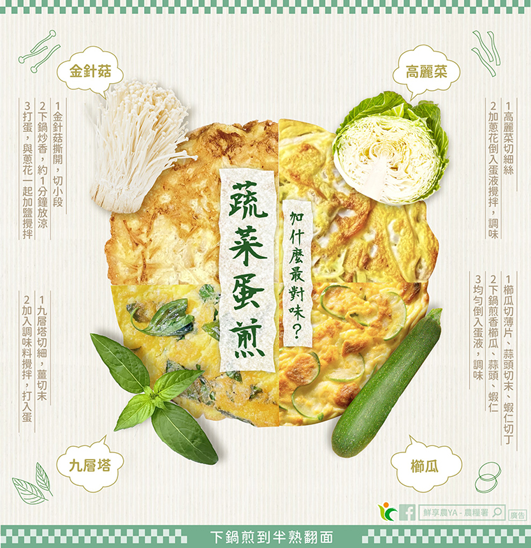 ▲煎蛋時可以選擇加入金針菇、高麗菜、九層塔、櫛瓜,補充蛋白質及膳食纖維。(圖/擷取自「鮮享農YA-農糧署」臉書粉專)