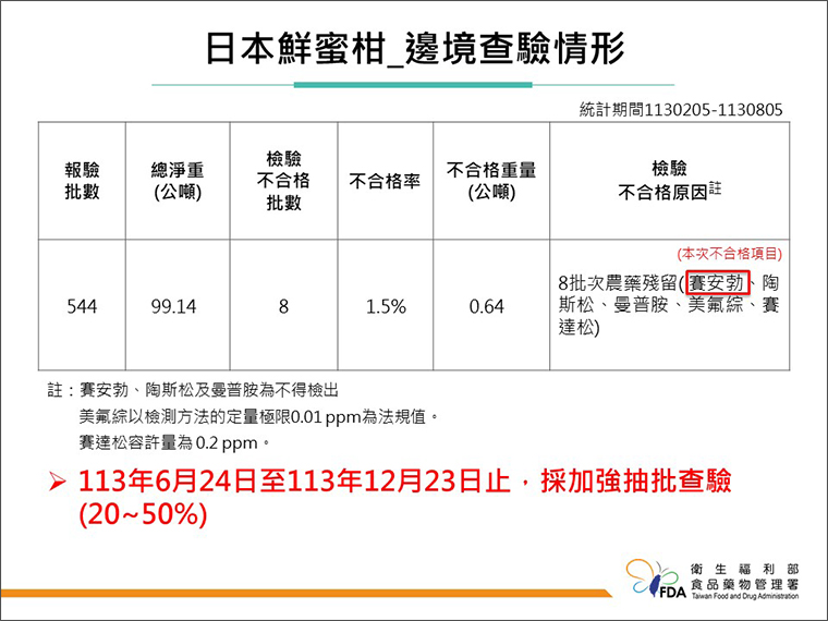 根據食藥署統計,從113年02月05日起至113年08月05日止,日本蜜柑的報驗批數為544批,檢驗不合格有8批,不合格率為1.5%,主要違規因素為檢驗到賽安勃、陶斯松、曼普胺等等農藥殘留不合格。林金富指出,食藥署已在113年6月24日至113年12月23日止,對於日本蜜柑採取加強抽批查驗,抽驗百分比為20至50%。