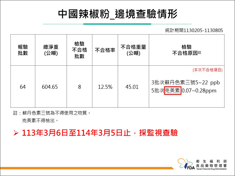 根據食藥署統計,從113年02月05日起至113年08月05日止,中國辣椒粉的報驗批數為64批,檢驗不合格有8批,不合格率為12.5%,違規因素有3批次檢驗到蘇丹色素3號,5批次檢驗到克美素。林金富指出,食藥署已在113年3月6日至114年3月5日止,對於中國辣椒粉採取監視查驗,也就是100%通過蘇丹色素及農藥檢驗合格才可輸台。