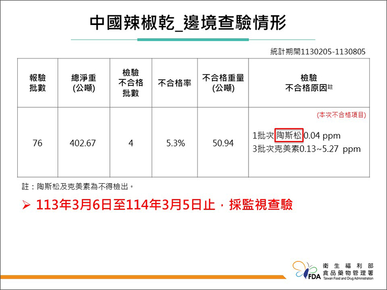 根據食藥署統計,從113年02月05日起至113年08月05日止,中國辣椒乾的報驗批數為76批,檢驗不合格有4批,不合格率為5.3%,違規因素有1批次檢驗到陶斯松,3批次檢驗到克美素。林金富指出,食藥署已在113年3月6日至114年3月5日止,對於中國辣椒乾採取監視查驗,也就是通過蘇丹色素及農藥檢驗合格才可輸入。