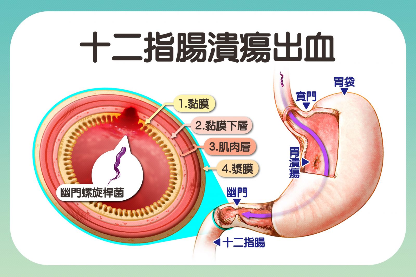 廖醫師透過胃鏡照片說明,十二指腸潰瘍已深入第3層肌肉,若超過第4層造成穿孔就需要手術,胃鏡檢查也發現王先生感染幽門螺旋桿菌,判定為潰瘍主因。他指出,幽門螺旋桿菌經由糞、口傳播,感染後能生存在酸性環境引發腸胃黏膜發炎、潰瘍,進而導致癌症,也因為感染幽門螺旋桿菌不易出現急性症狀,較容易被忽視。