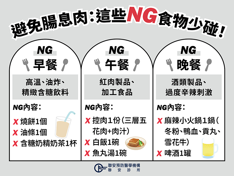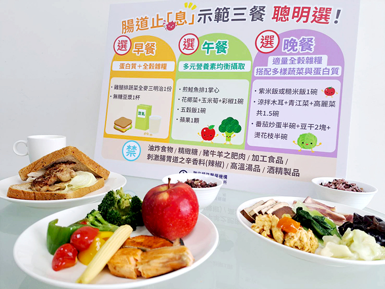 聯安營養師徐景宜「腸道止息示範三餐」為範例菜單提供建議,民眾早餐可以選擇蛋白質及全榖雜糧的組合,如雞腿排蔬菜全麥三明治、無糖豆漿。午餐應注重多元營養素均衡攝取,如鮭魚時蔬五穀米餐盒搭配水果。晚餐則建議適量的全榖雜糧,如紫米飯或糙米飯1碗,搭配多樣蔬菜與蛋白質,可以選擇涼拌木耳、龍鬚菜、高麗菜等蔬菜共1.5碗,及含番茄炒蛋半碗、豆干2塊、燙花枝半碗之足量的蛋白質料理。