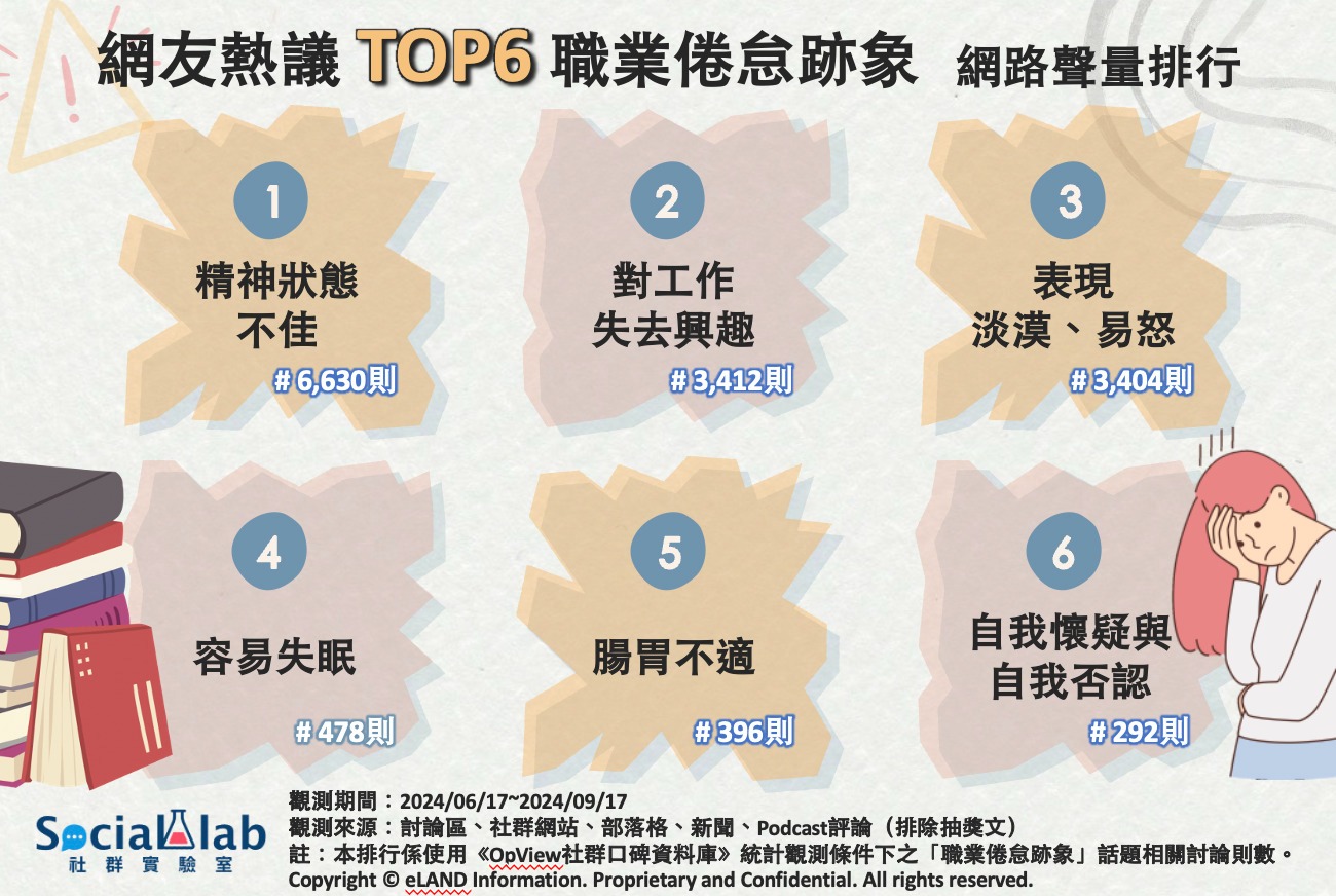 【NOW健康 翁靖祐/台北報導】最近上班總是心好累,難道是遇到「職業倦怠」了嗎?在現今高度競爭的職場環境中,許多人往往無法取得足夠的休息、在生活和工作中找到平衡,容易在不知不覺間影響情緒、引起身體不適,甚至是對工作失去熱情。這種種生理與心理上的反應,都有可能是職業倦怠的跡象,卻也因不易察覺,令不少民眾難以及時調整狀態。接著就一起來看看有哪些受到網友們熱議的職業倦怠徵兆吧!《Social Lab社群實驗室》本次透過《OpView社群口碑資料庫》追蹤近3個月內「職業倦怠跡象」話題的網路聲量表現,帶您了解網友熱議的職業倦怠跡象排行。