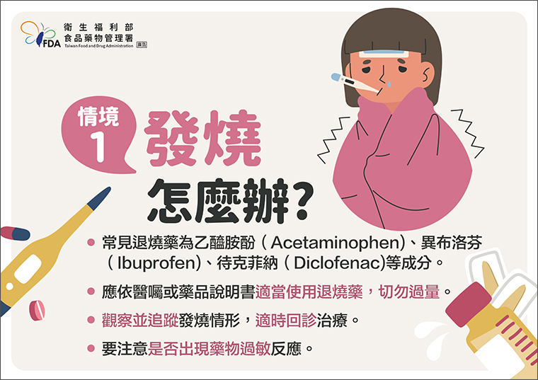 孩子發燒時都會使用退燒藥,食藥署說明,常見退燒藥為乙醯胺酚(Acetaminophen)、異布洛芬(Ibuprofen)、待克菲納(Diclofenac)等成分,家長應依醫囑或藥品說明書適當使用退燒藥,切勿過量,同時觀察追蹤孩子發燒情形,適時回診治療,也要注意是否出現藥物過敏反應。